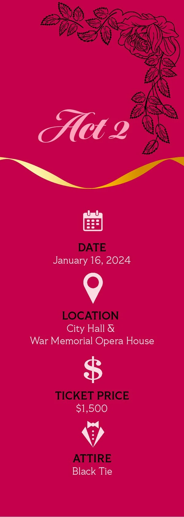 Inside, “Act 1” and “Act 2” are placed on opposing flaps to organize the gala itinerary in a theatrical structure, mirroring the pacing of a live performance. This separation reinforces the idea that the event itself is a staged experience, guiding guests through different moments of the evening as if they are acts within a performance.