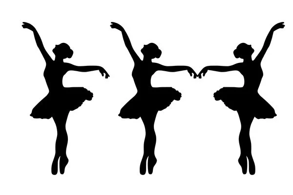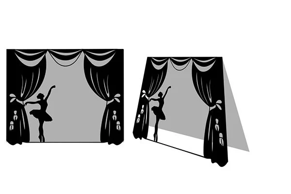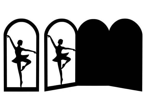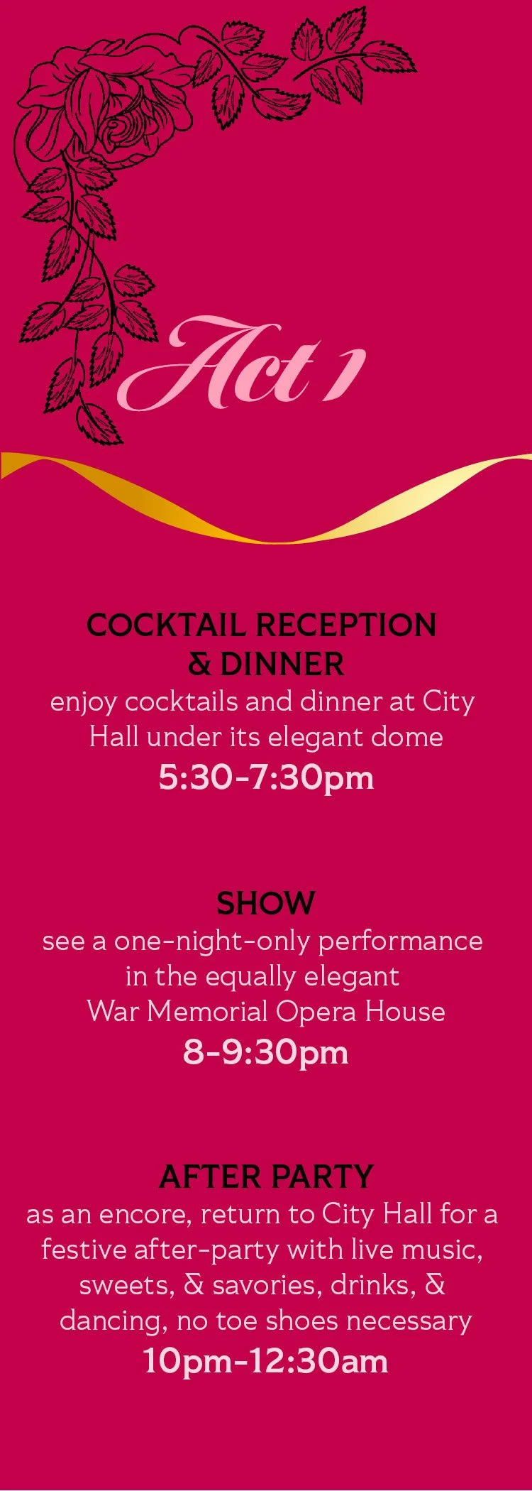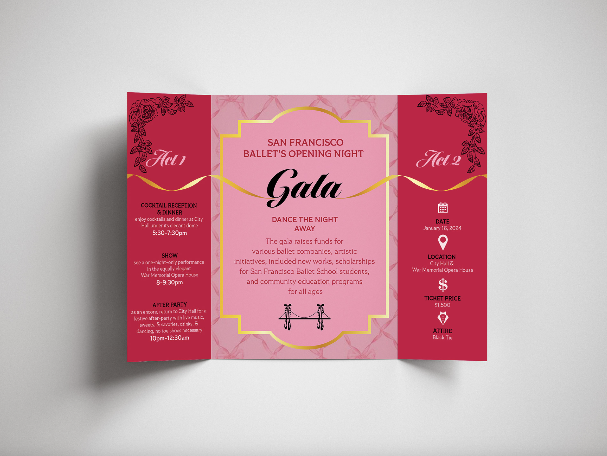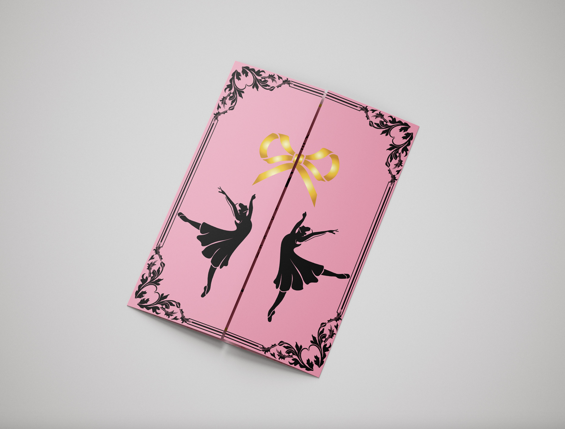 The front of the invitation is designed as a trifold experience that unfolds like a narrative. A black border frames the cover with ornate corner detailing for a refined, classical feel. On either side of the flaps, silhouetted dancers create symmetry and movement, flanking a central gold bow. When opened, the bow feels like it unravels, guiding the viewer into the world of the gala and carrying them across the entire invitation.