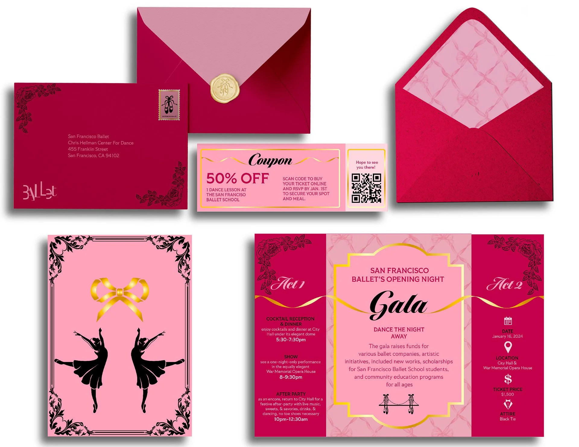 I designed a complete invitation system for the San Francisco Ballet Gala after immediately forming a clear visual direction when I saw it on the list of event options. The project explored both print and digital applications, beginning with a cohesive set that included the physical invitation, envelope, and an accompanying promotional coupon insert. Each piece was designed to work together as a unified system while reflecting the elegance of the event. The concept was then extended into a digital version, where I created and prototyped an online invitation experience to ensure the design translated seamlessly across formats while maintaining consistency and refinement.